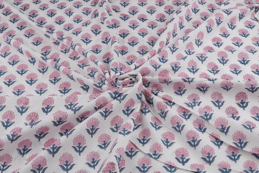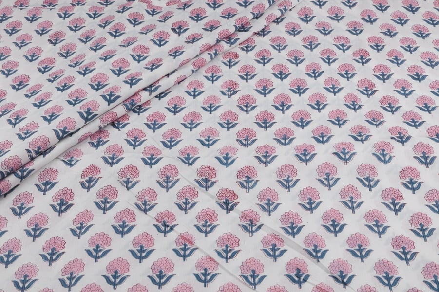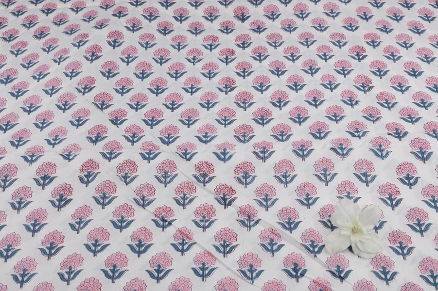 White Floral Handblock Printed 100% Pure Soft Cotton Fabric