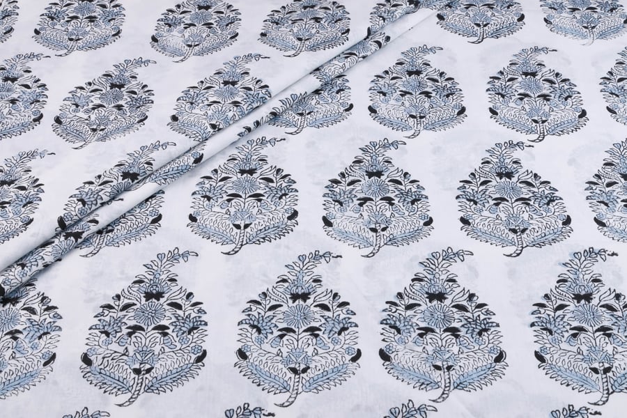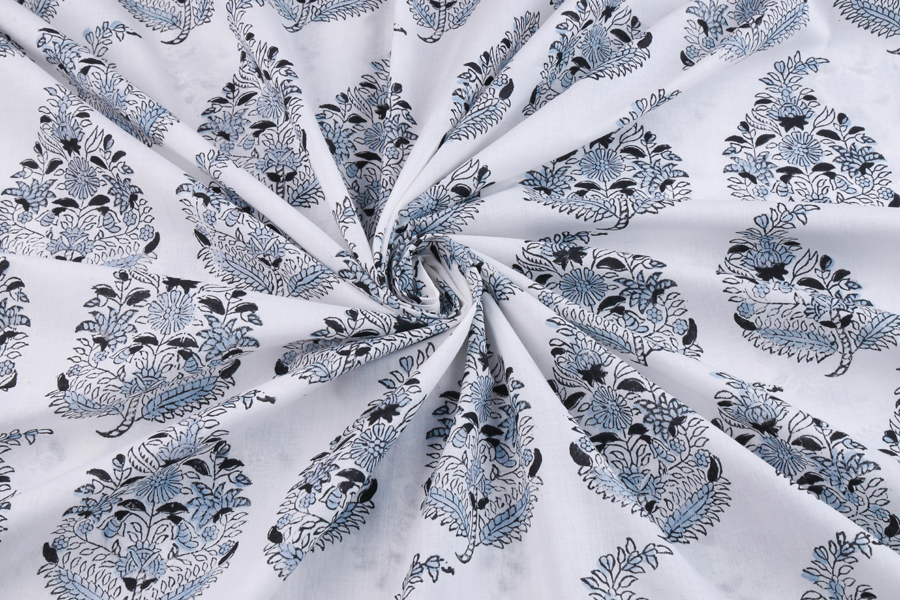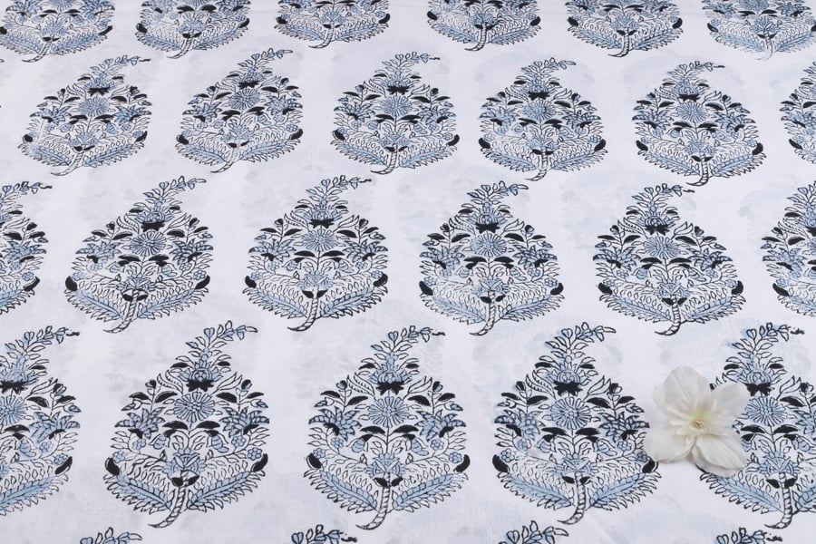 Sky Blue Floral Handblock Printed 100% Pure Soft Cotton Fabric