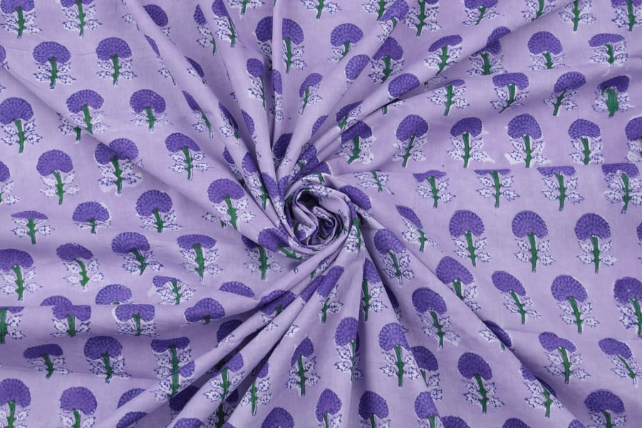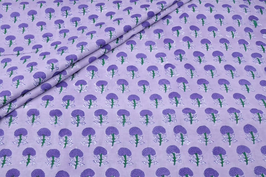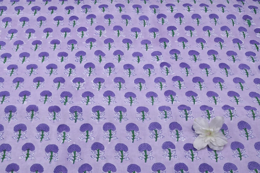 Wisteria Purple Floral Handblock Printed 100% Pure Soft Cotton Fabric