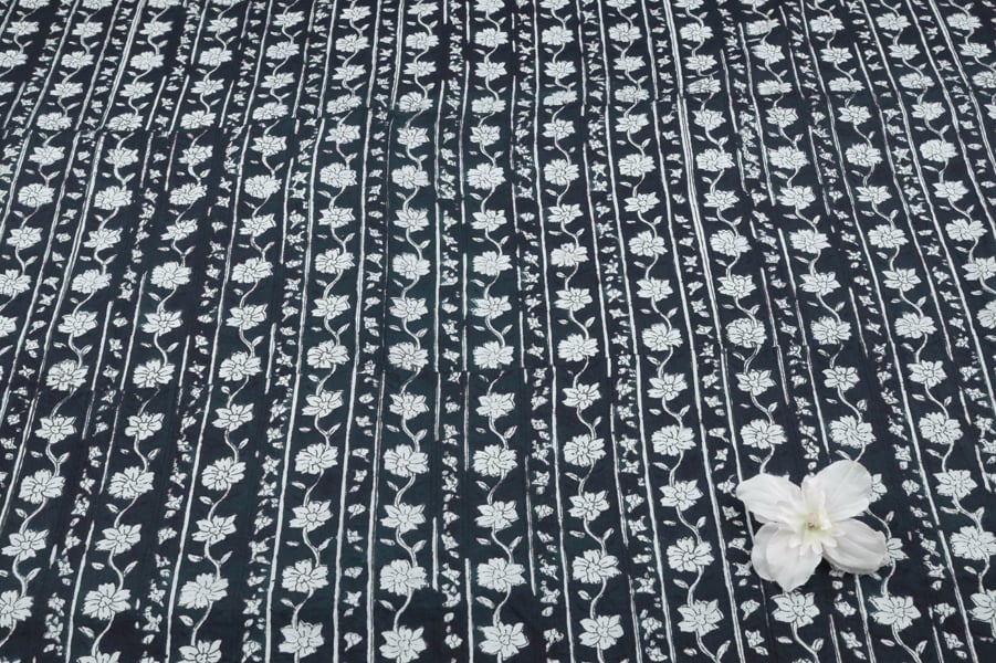 Black Floral Handblock Printed 100% Pure Soft Cotton Fabric