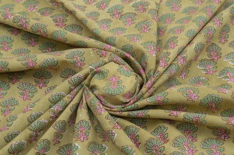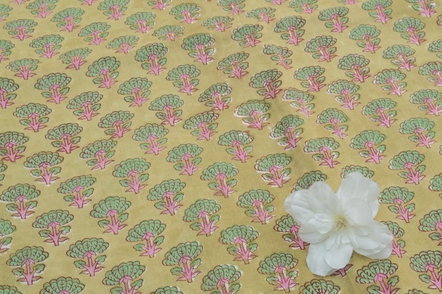 Straw Yellow Floral Handblock Printed 100% Pure Soft Cotton Fabric