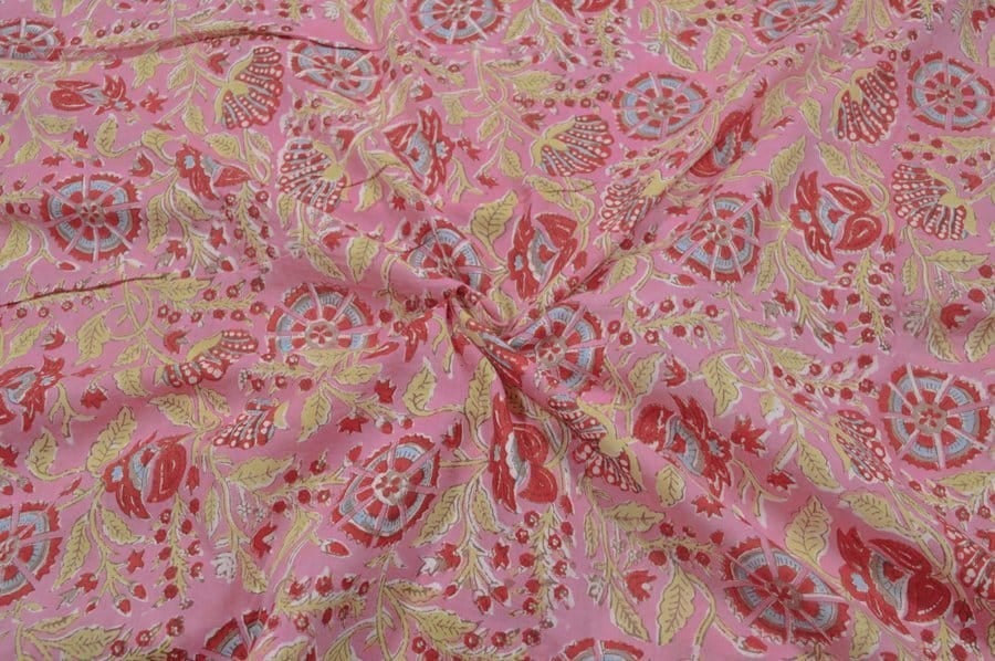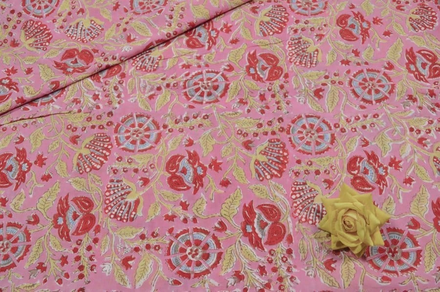 Flamingo Pink Floral Handblock Printed 100% Pure Soft Cotton Fabric