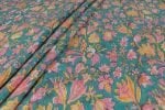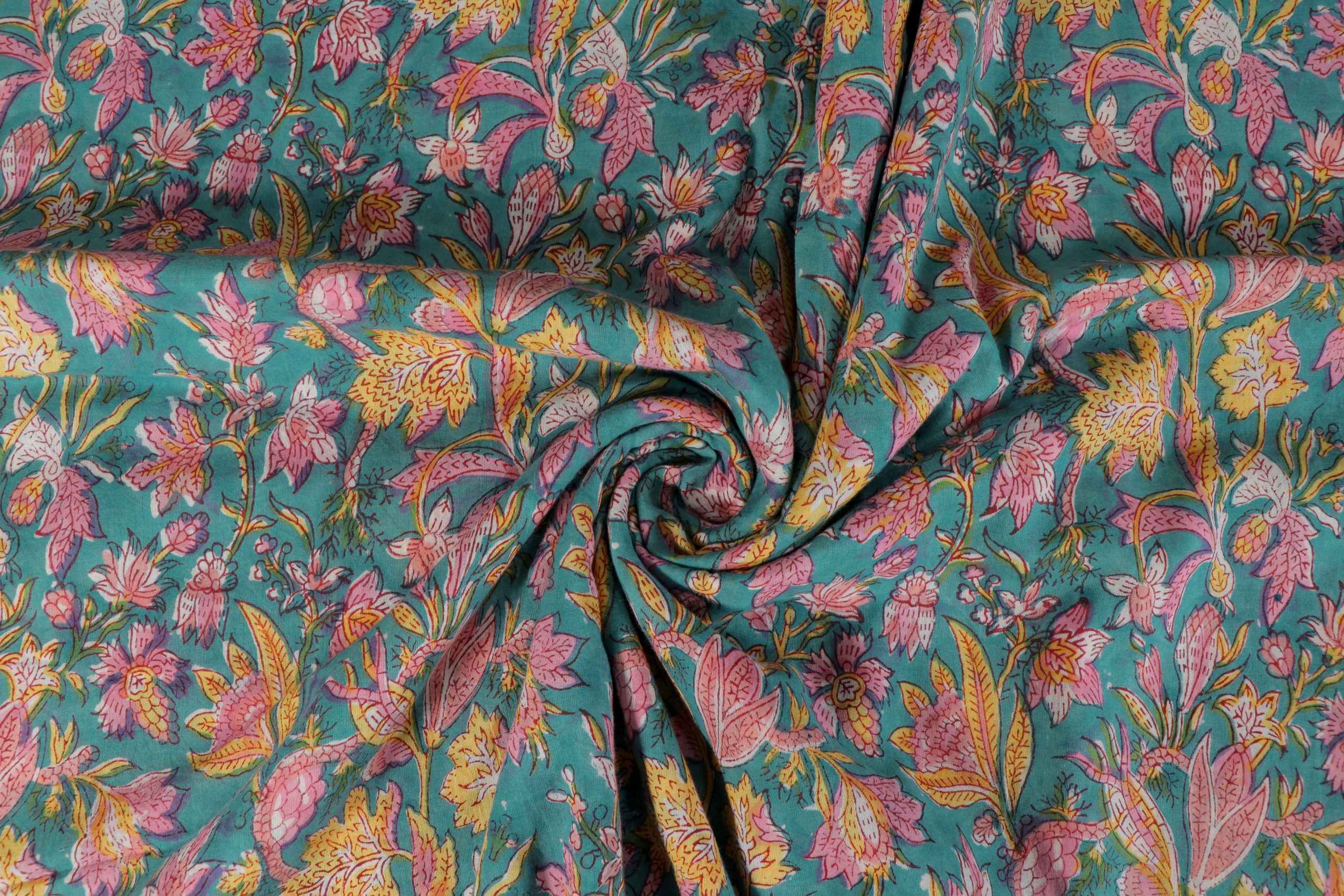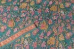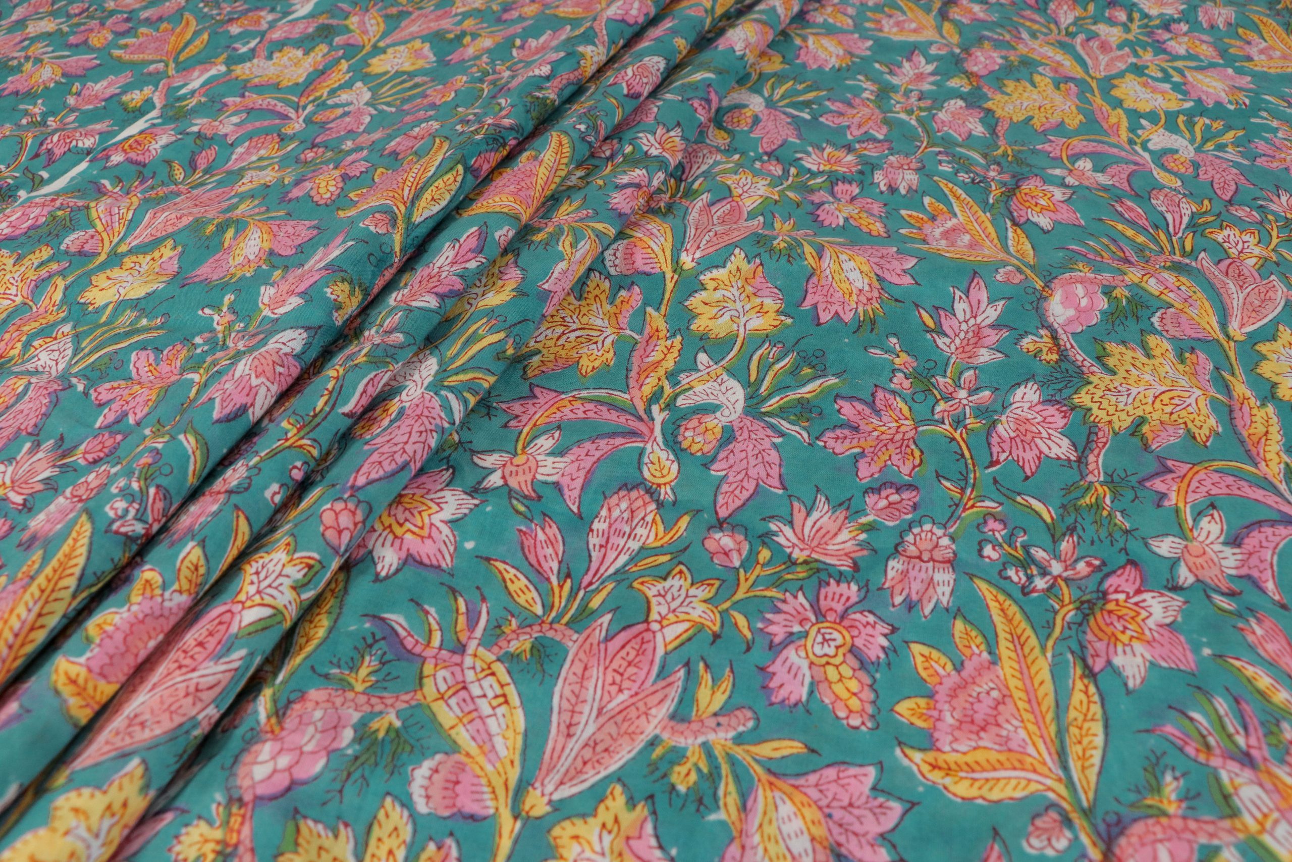 Teal Green Floral Handblock Printed 100% Pure Soft Cotton Fabric