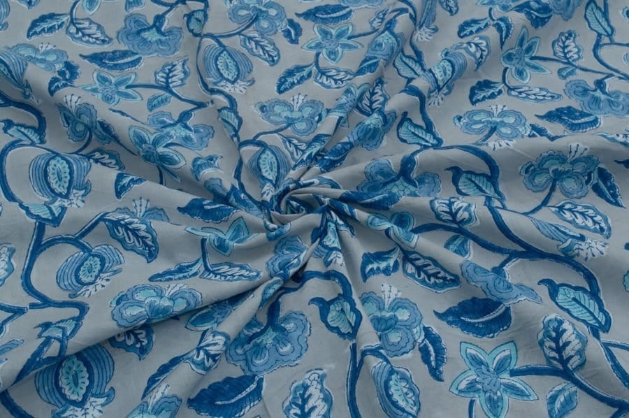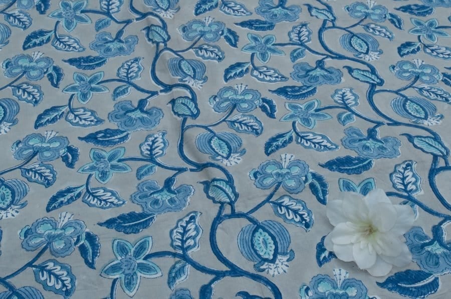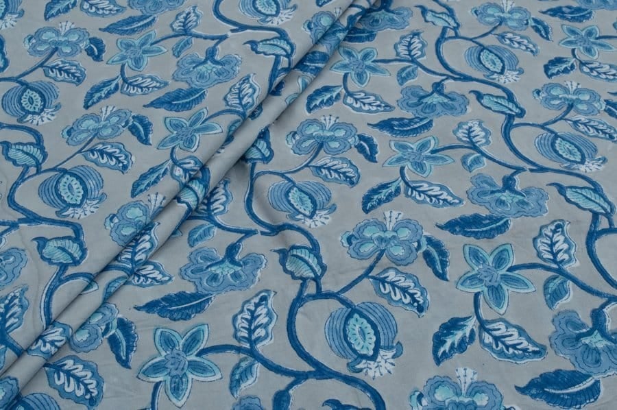 Gray Floral Handblock Printed 100% Pure Soft Cotton Fabric