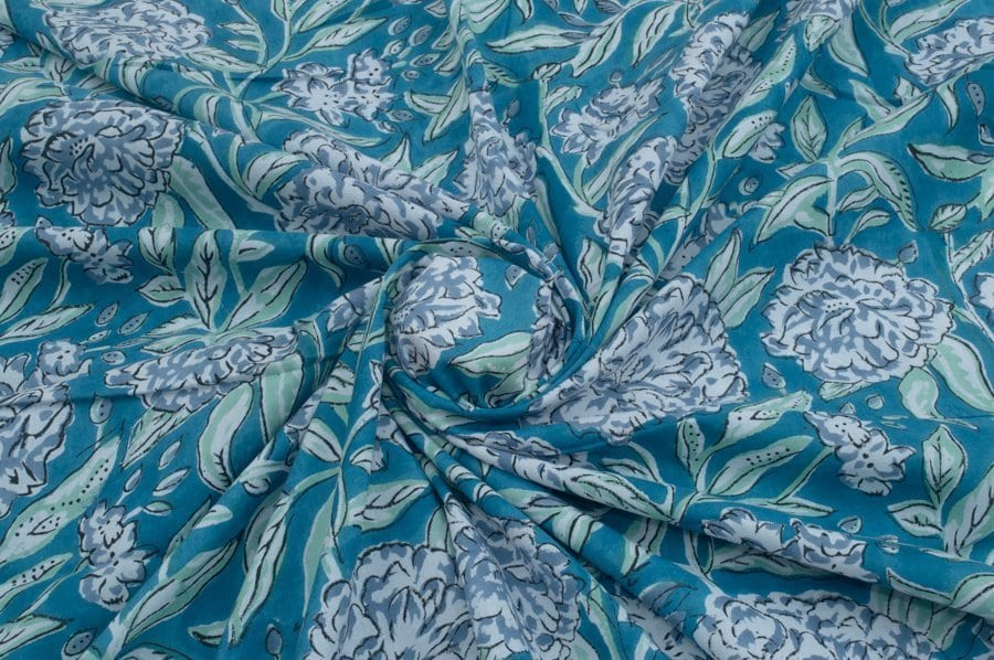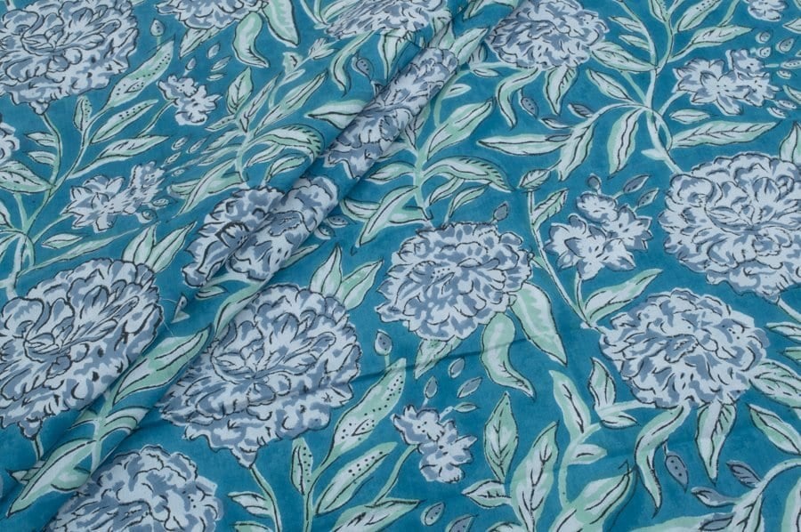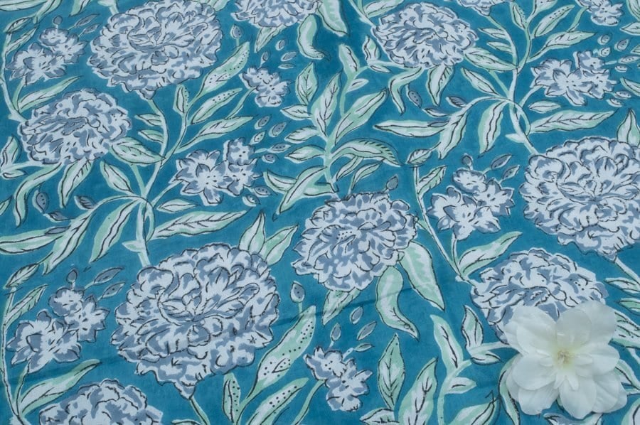 Electric Blue Floral Handblock Printed 100% Pure Soft Cotton Fabric
