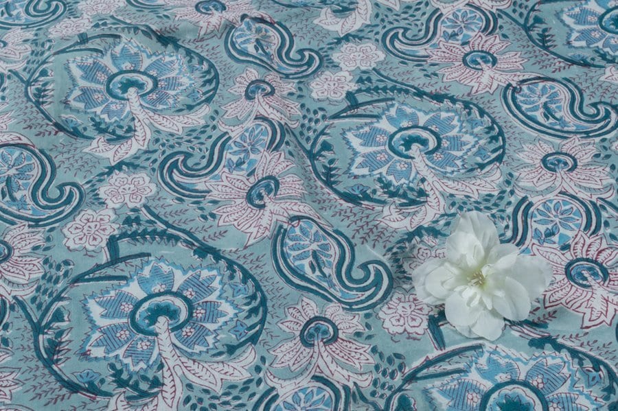 Powder Blue Floral Handblock Printed 100% Pure Soft Cotton Fabric