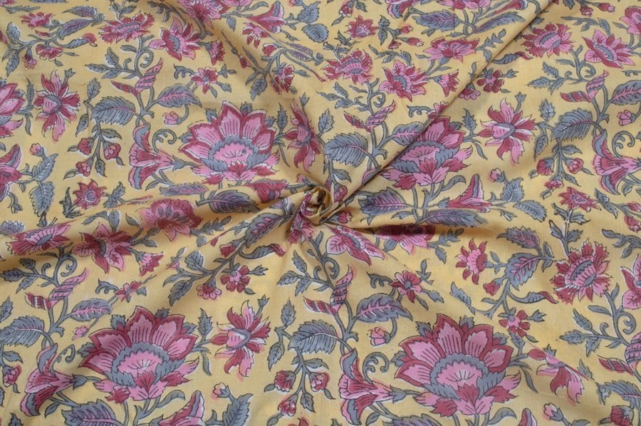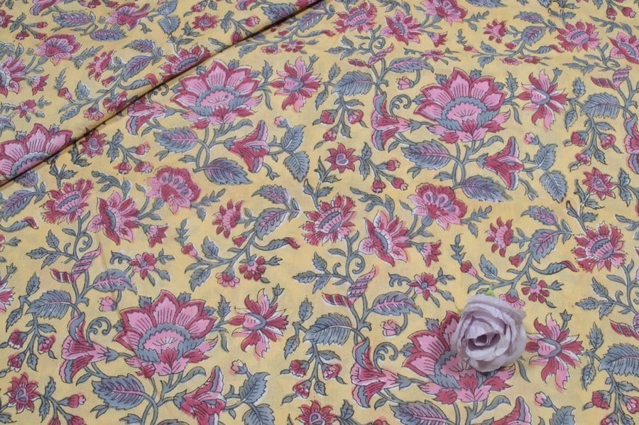 Jasmine Yellow Floral Handblock Printed 100% Pure Soft Cotton Fabric