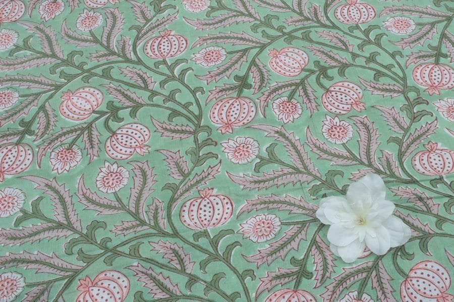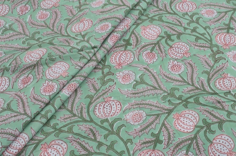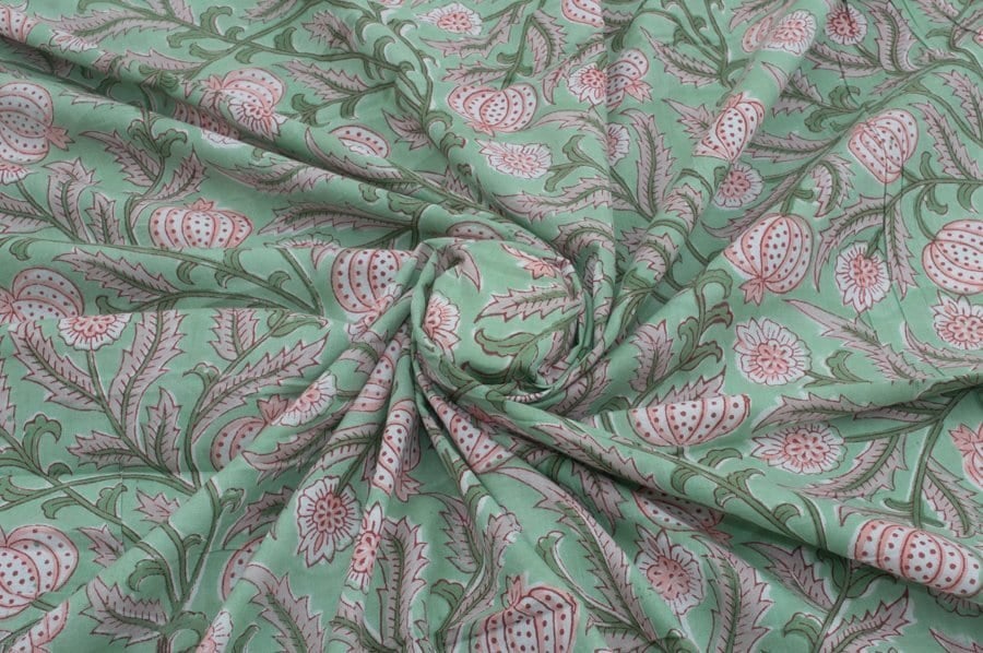 Moss Green Floral Handblock Printed 100% Pure Soft Cotton Fabric