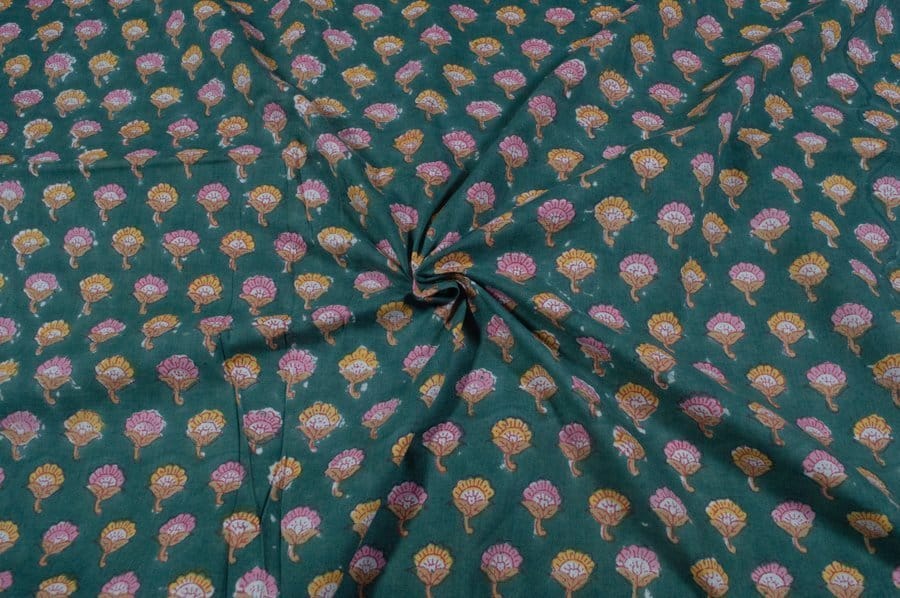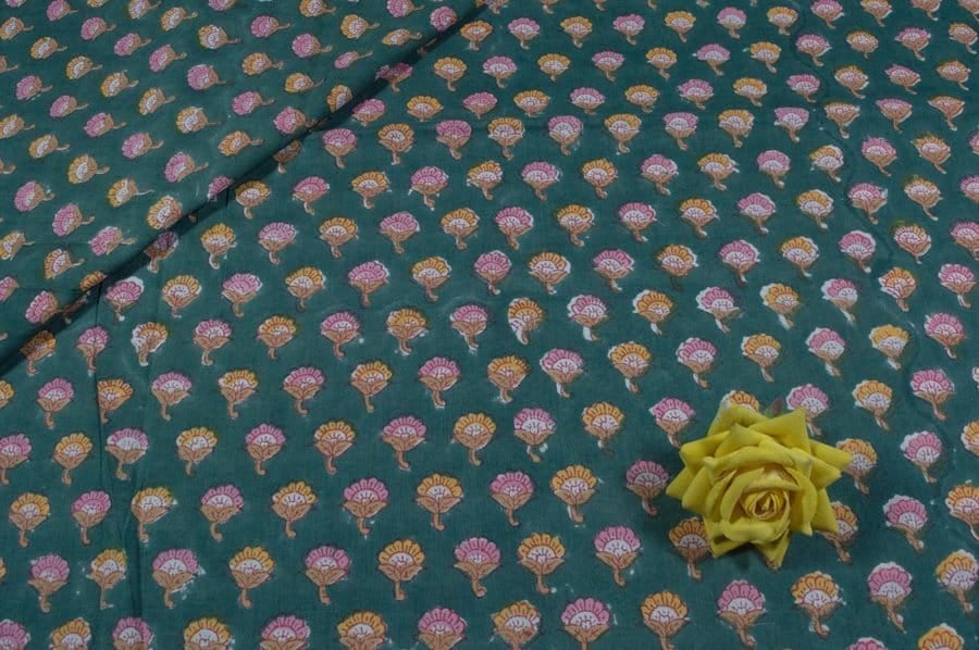 Teal Green Floral Handblock Printed 100% Pure Soft Cotton Fabric