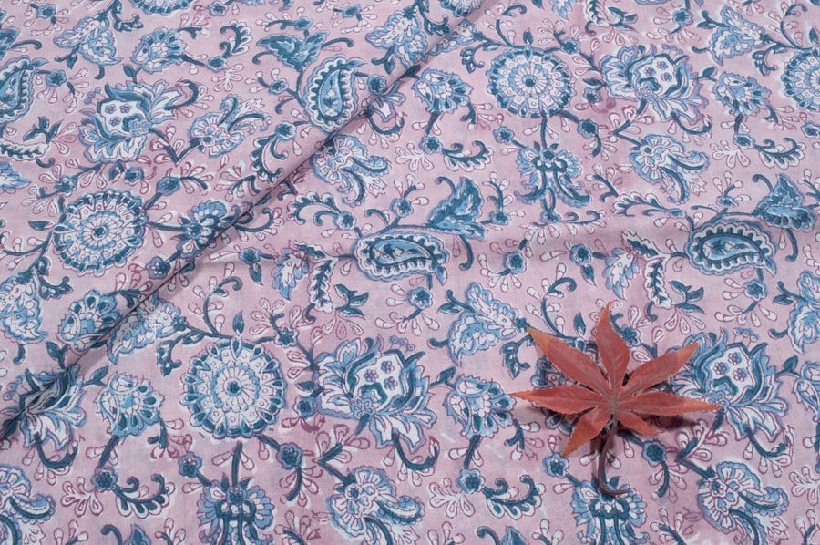 Pastel Pink Floral Handblock Printed 100% Pure Soft Cotton Fabric