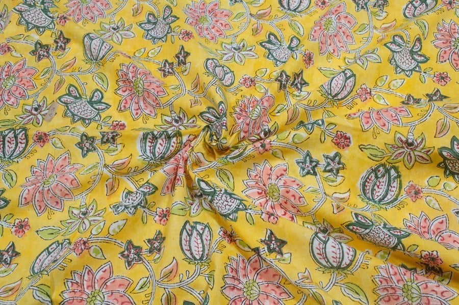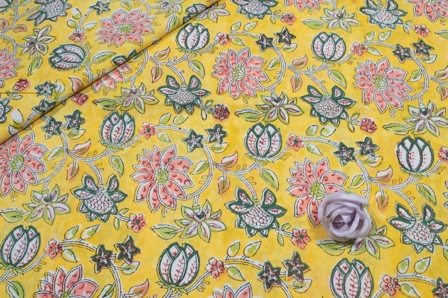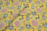 Golden Yellow Floral Handblock Printed 100% Pure Soft Cotton Fabric
