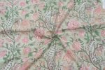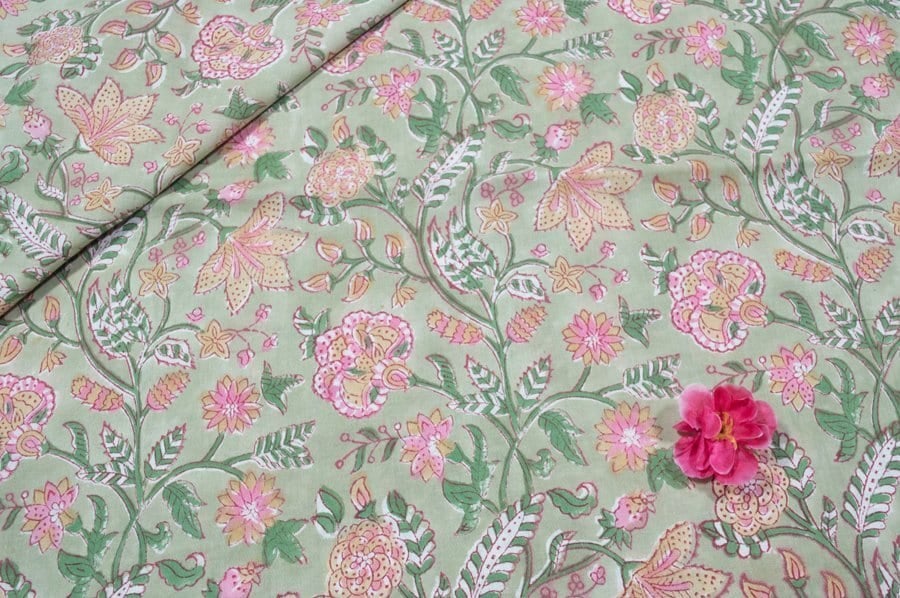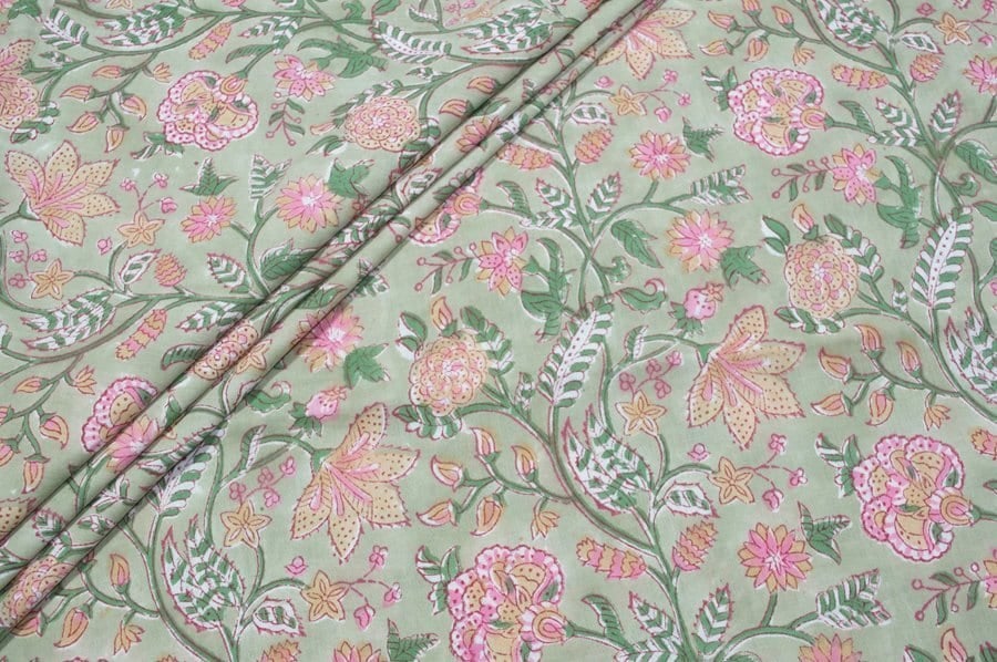 Moss Green Floral Handblock Printed 100% Pure Soft Cotton Fabric