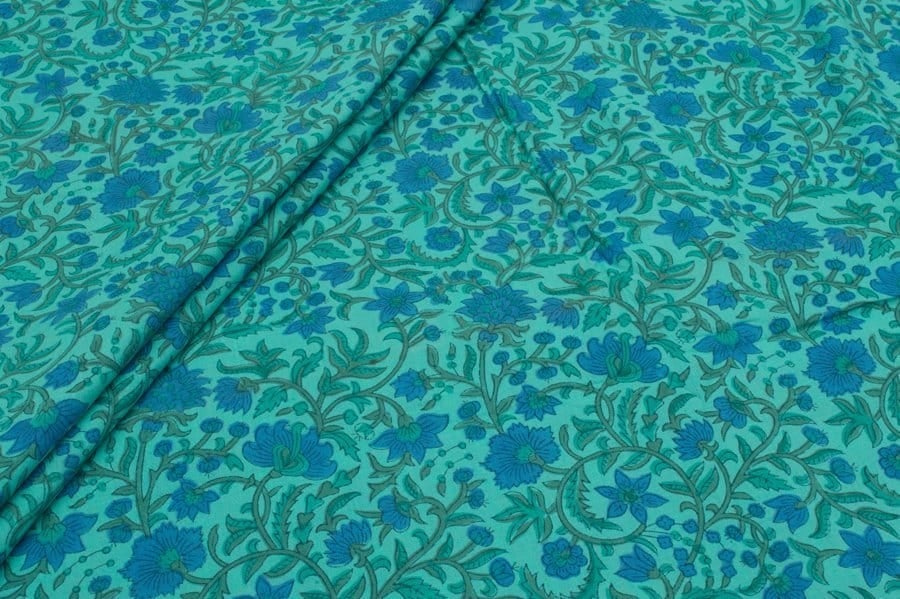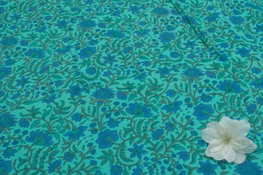 Turquoise Blue Floral Handblock Printed 100% Pure Soft Cotton Fabric