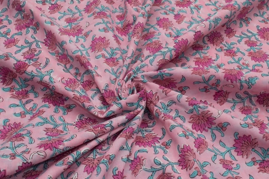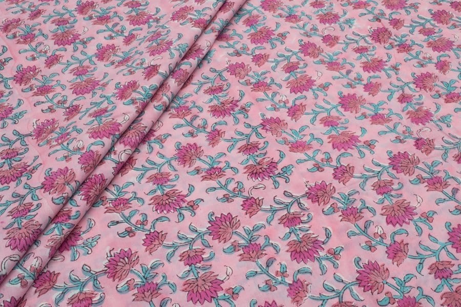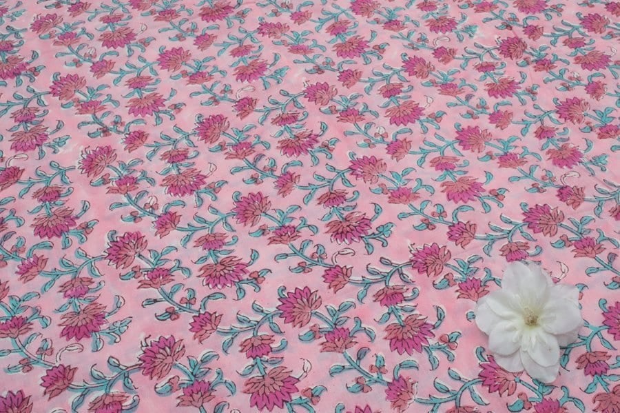 Cherry Pink Floral Handblock Printed 100% Pure Soft Cotton Fabric