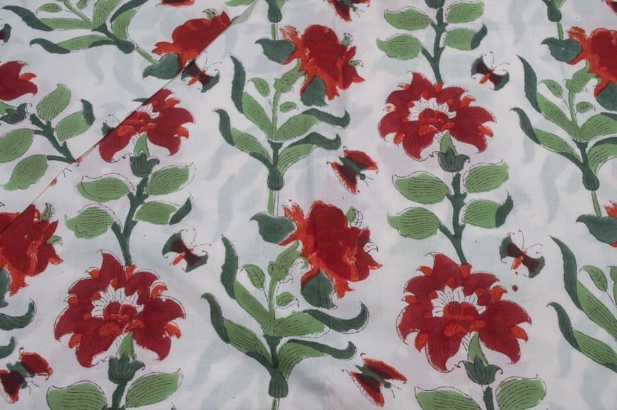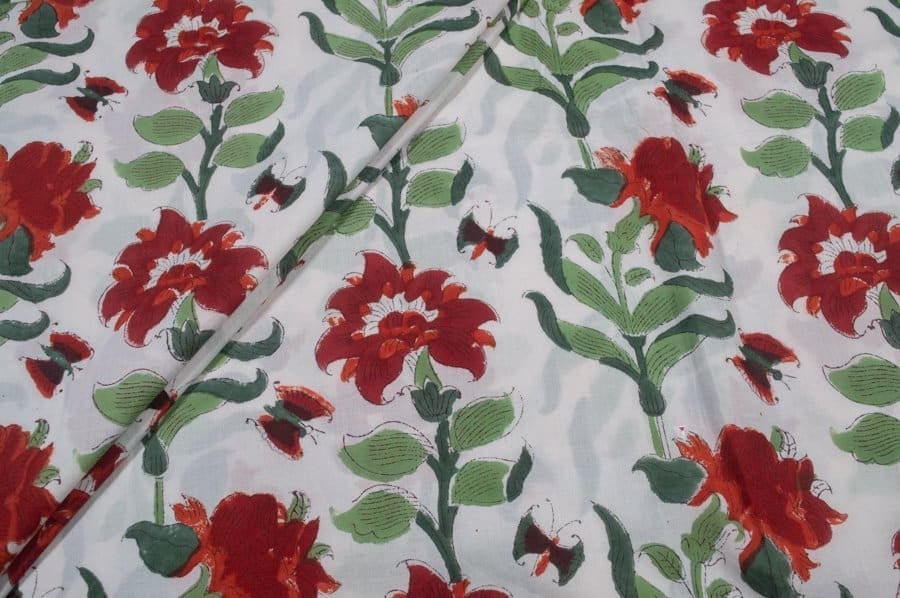White Floral Handblock Printed 100% Pure Soft Cotton Fabric