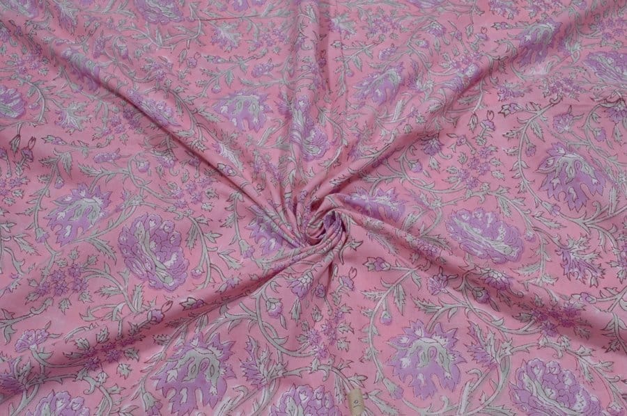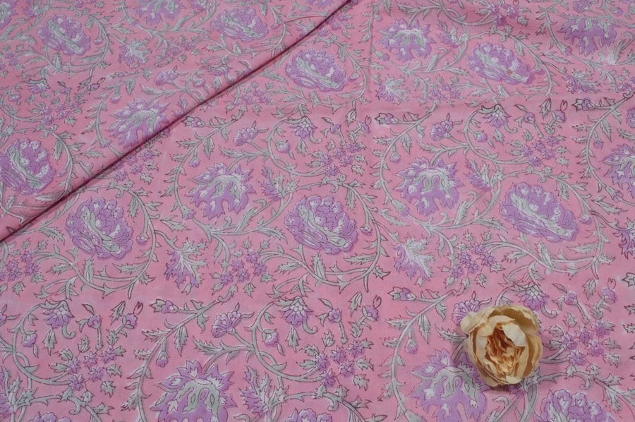 Cherry Pink Floral Handblock Printed 100% Pure Soft Cotton Fabric