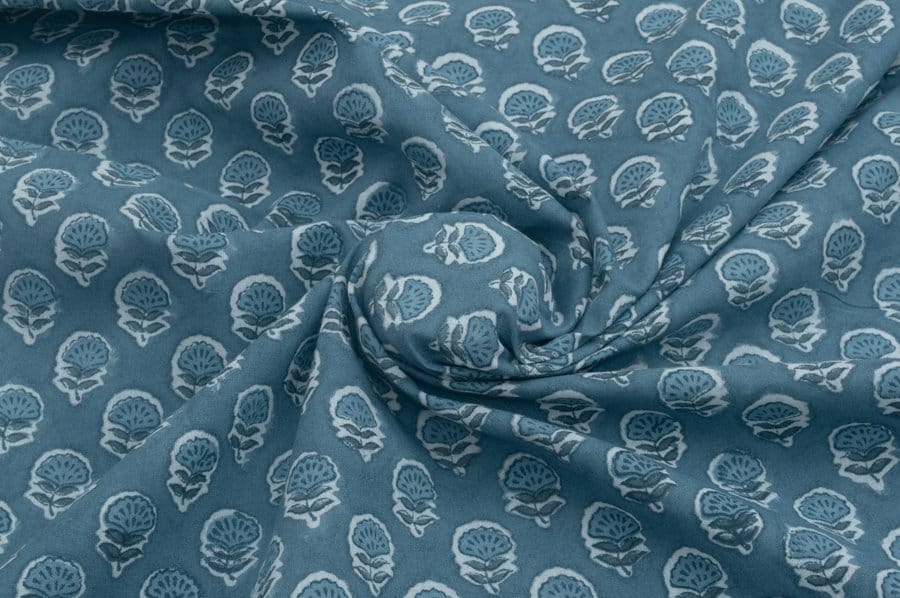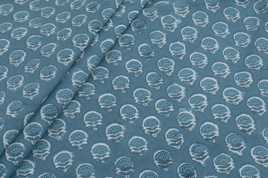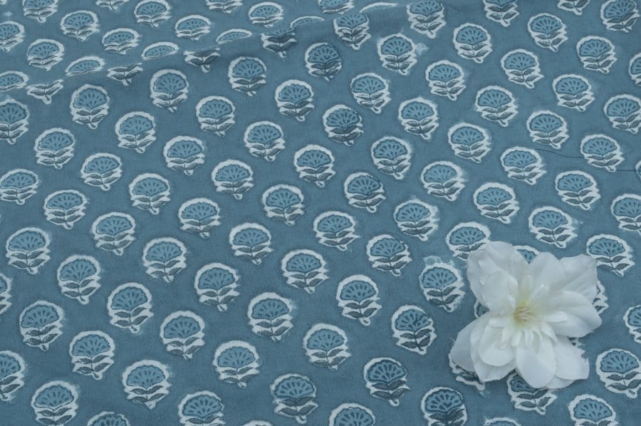 Blue Gray Floral Handblock Printed 100% Pure Soft Cotton Fabric