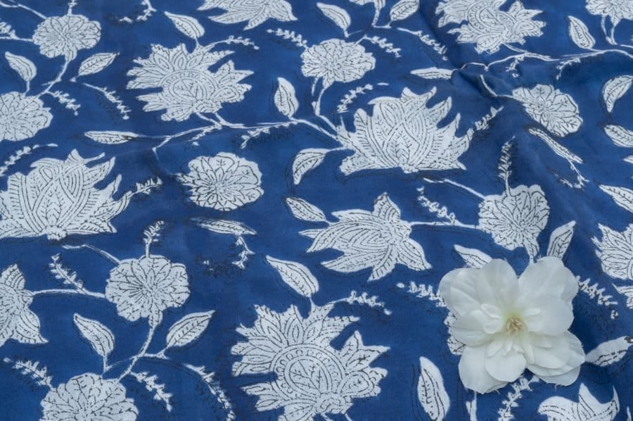 Cobalt Blue Floral Handblock Printed 100% Pure Soft Cotton Fabric