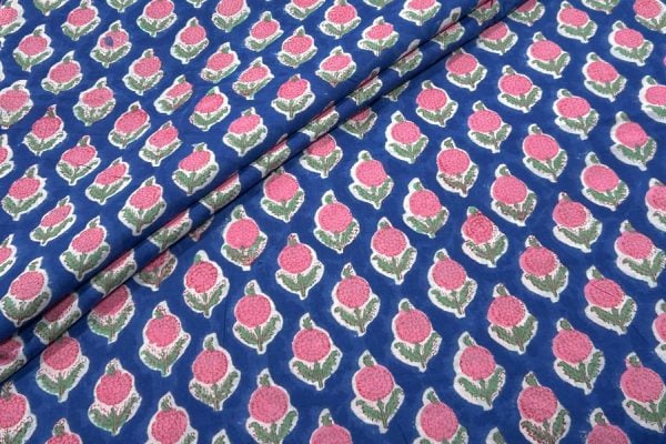 Pre-Cut 2.20m Dark Blue Floral Handblock Printed 100% Pure Soft Cotton Fabric
