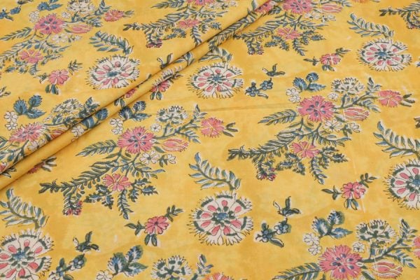 Pre-Cut 2m Bright Yellow Floral Handblock Printed 100% Pure Soft Cotton Fabric