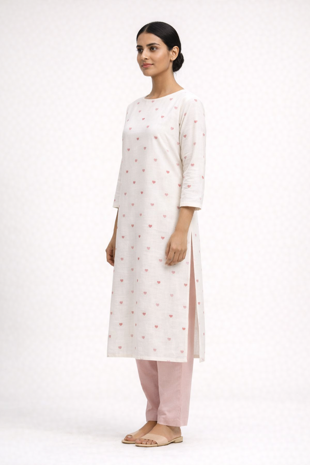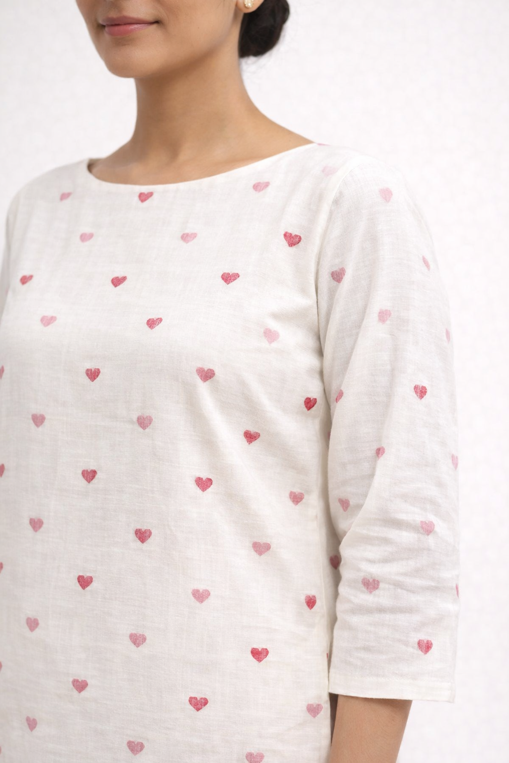 Crafted in breathable pure cotton, it features delicate blush heart motifs placed in a balanced repeat. The straight silhouette ensures a clean vertical fall, while the boat neckline and 3/4 sleeves maintain timeless proportion.