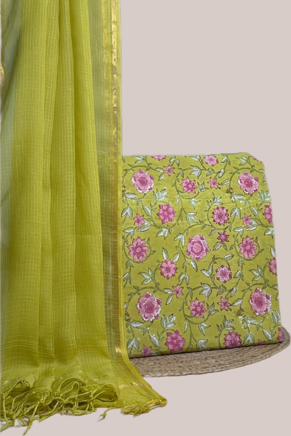 Green - 2pc Kota Doria Dupatta and Pure Soft Cotton Blockprint Top Fabric Set