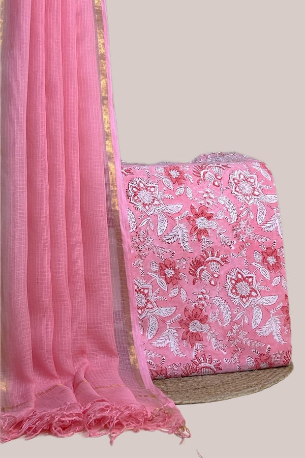 Pink - 2pc Kota Doria Dupatta and Pure Soft Cotton Blockprint Top Fabric Set