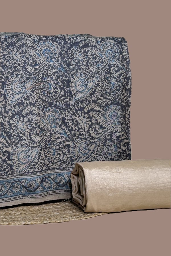 2.8mtr Top + 2.5mtr Bottom – Tussar Silk Blockprinted Top with Pure Silk Bottom Fabric Set