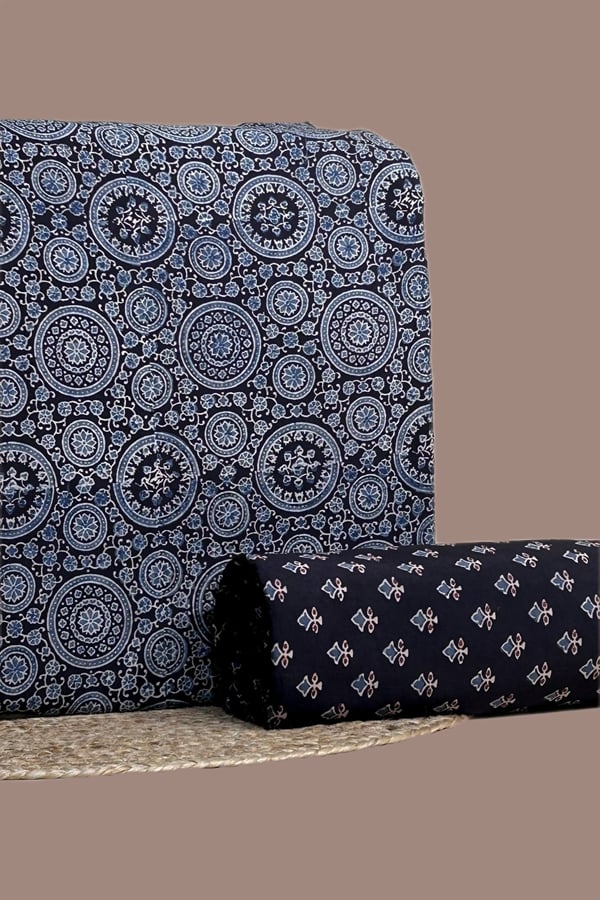 2.5mtr Each – Natural Dye Ajrakh HandBlock Printed Cotton Top and Bottom Cotton Fabric Set