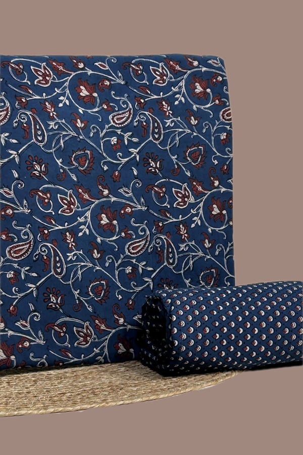 2.5mtr Each – Natural Dye Ajrakh HandBlock Printed Cotton Top and Bottom Cotton Fabric Set
