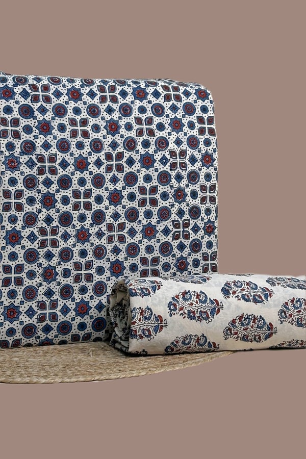 White - 2pc Ajrakh HandCrafted Cotton Top and Bottom Cotton Fabric Set