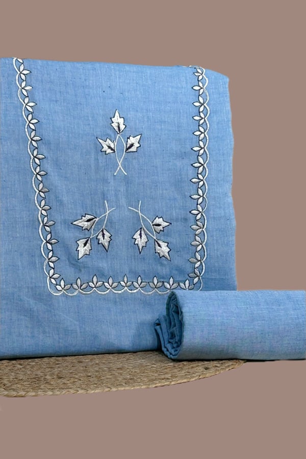 Blue – 2Pc Handloom Embroidered Neck Design Soft Cotton Top(3m) Bottom(2.5m) Fabric Set