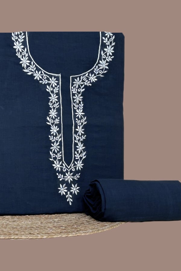 Blue – 2Pc Handloom Embroidered Neck Design Soft Cotton Top(3m) Bottom(2.5m) Fabric Set
