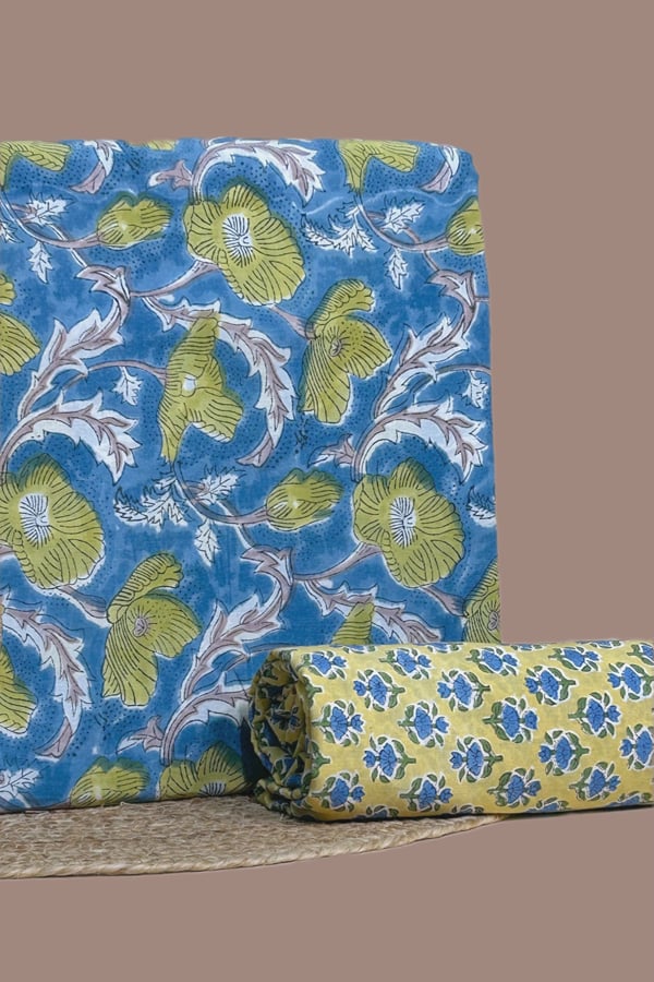 Blue – 2pc Pure Soft Cotton Blockprinted Top and Bottom Fabric Set