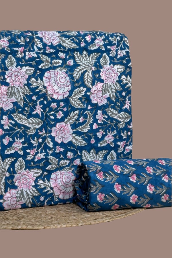 Blue – 2pc Pure Soft Cotton Blockprinted Top and Bottom Fabric Set