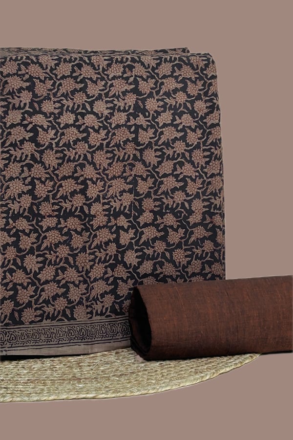 Brown - 2pc Bagh Handblock Top and Handloom Bottom Cotton Fabric Set