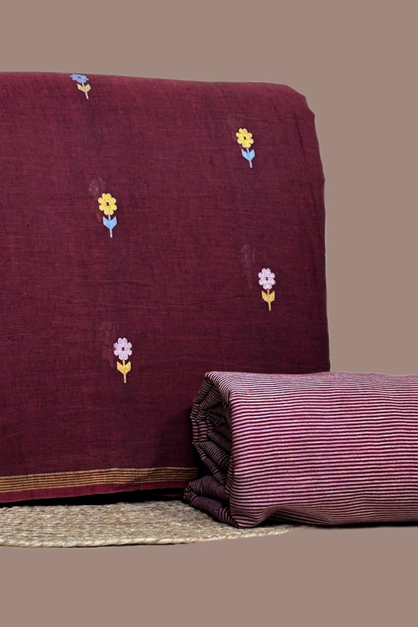 Maroon – 2pc Handloom Woven Design Cotton Top and Handloom Stripe Soft Cotton Bottom Fabric Set