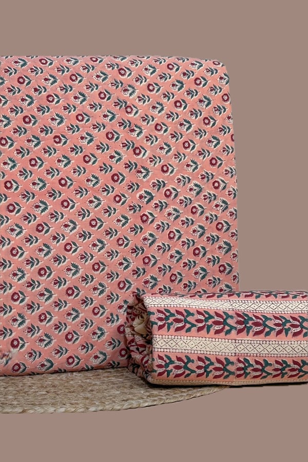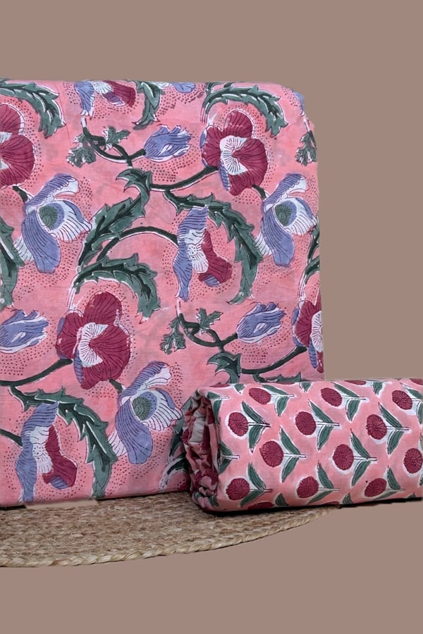 Pink - 2pc Pure Soft Cotton Blockprinted Top and Bottom Fabric Set