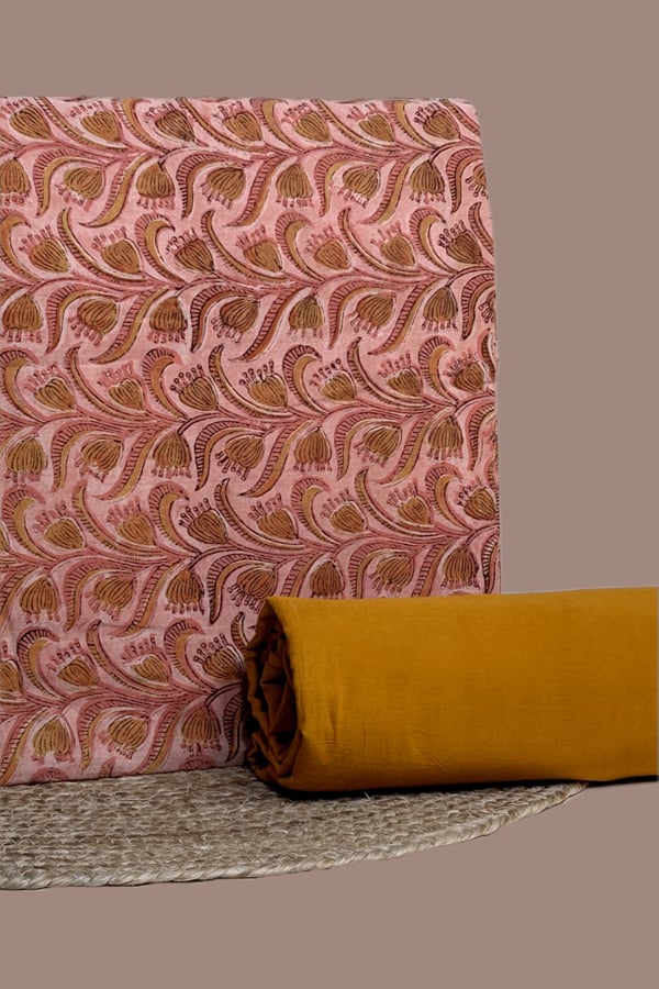 Pink – 2pc Bagru Handblock Top and Plain Dyed Bottom Cotton Fabric Set