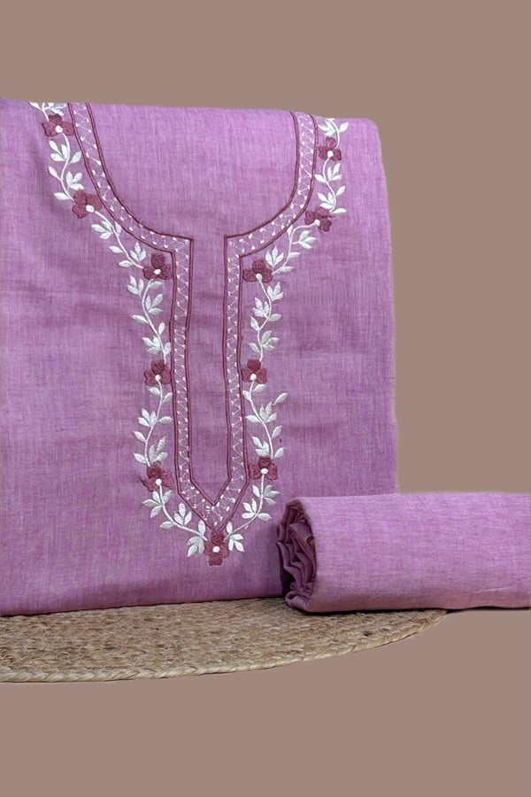 Pink – 2Pc Handloom Embroidered Neck Design Soft Cotton Top(3m) Bottom(2.5m) Fabric Set