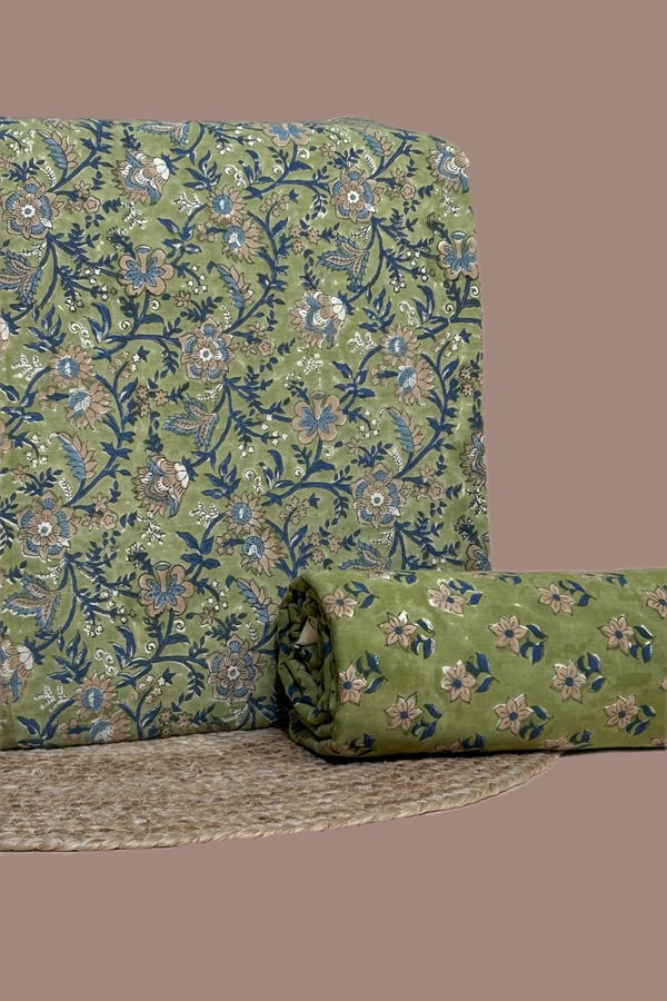 Green - 2pc Pure Soft Cotton Blockprinted Top and Bottom Fabric Set