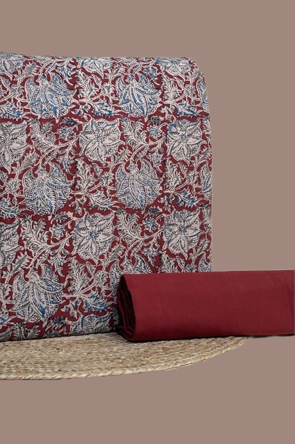 2.5mtr Each – Maheshwari Silk Kalamkari Blockprint Top With Plain Dyed Cotton Bottom Fabric Set