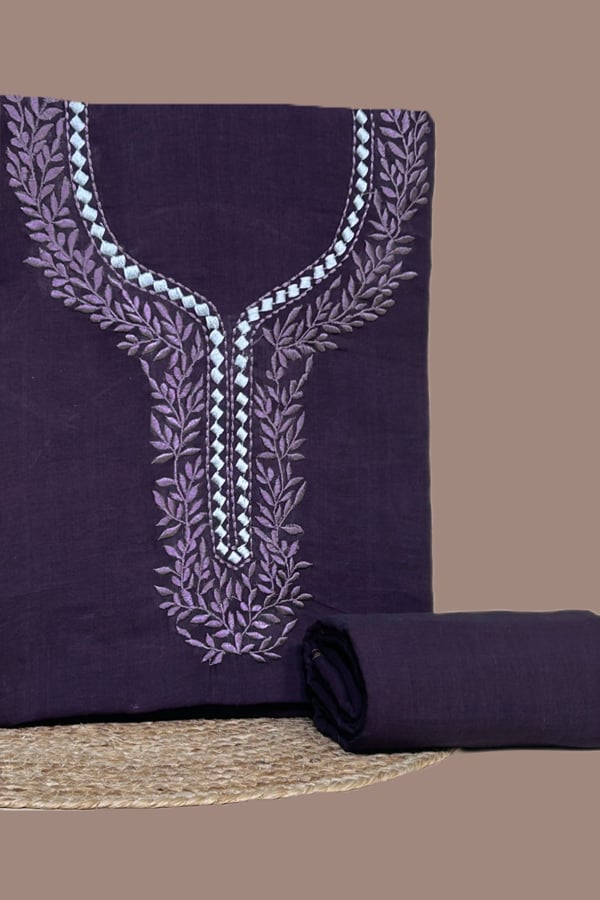 Purple - 2Pc Handloom Embroidered Neck Design Soft Cotton Top(3m) Bottom(2.5m) Fabric Set