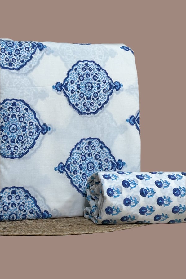 White – 2pc Pure Soft Cotton Blockprinted Top and Bottom Fabric Set
