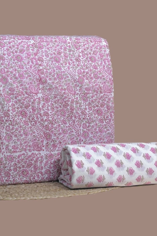 Pink - 2pc Pure Soft Cotton Blockprinted Top and Bottom Fabric Set