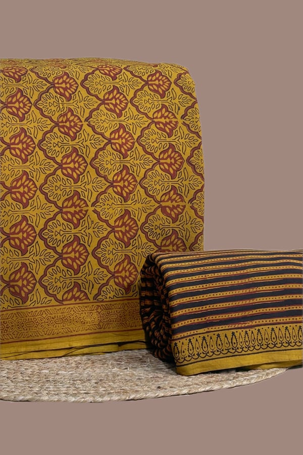 This Fabric is handloom woven and / or hand printed using vegetable dyes. There might be slight irregularities in the motif & colour shade which is a result of human involvement & is a hallmark of fabrics made by hand. Since the fabric is dyed using natural, vegetable dyes, it may rub dry or bleed colour on coming in contact with water for the first time.
