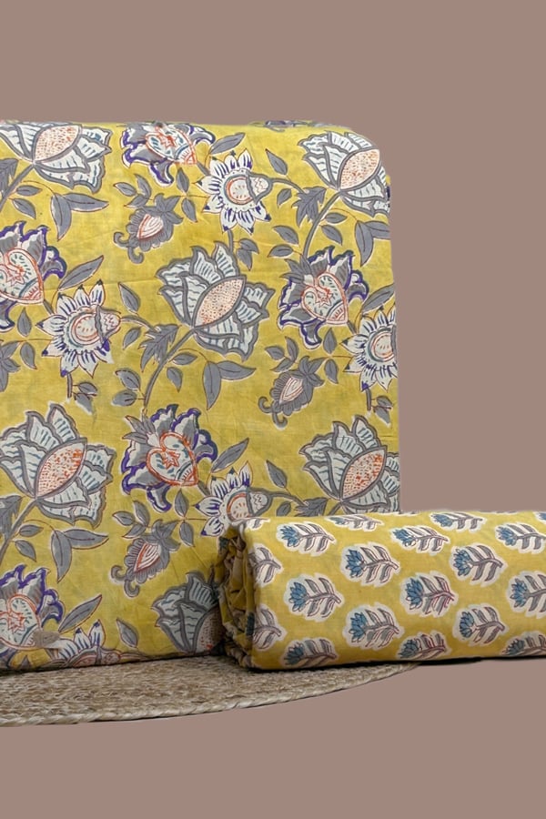 Yellow – 2pc Pure Soft Cotton Blockprinted Top and Bottom Fabric Set
