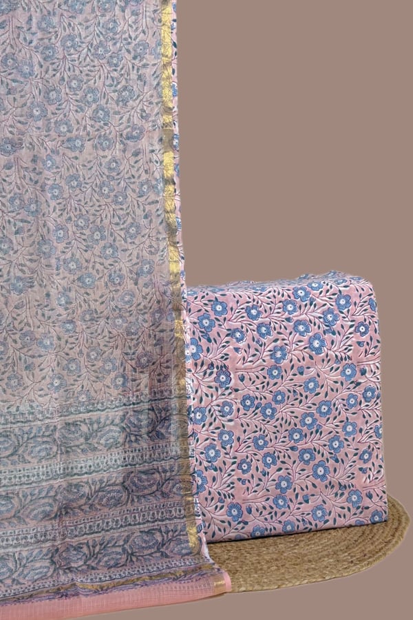 2.5mtr Each – Kota Doria Dupatta with HandBlock Printed Pure Soft Cotton Top Fabric Set