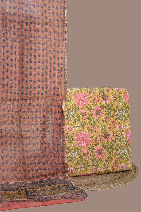 2.5mtr Each – Kota Doria Dupatta with HandBlock Printed Pure Soft Cotton Top Fabric Set