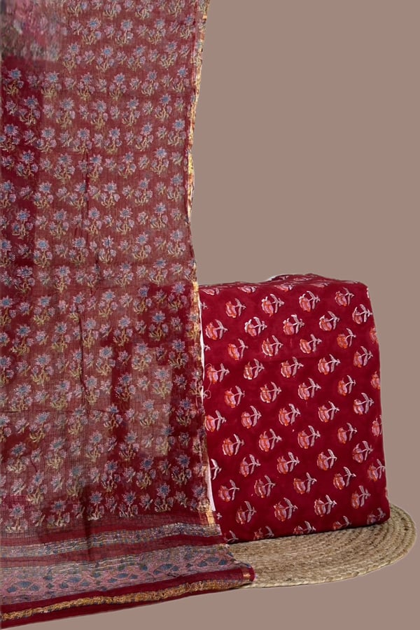2pc Kota Doria Dupatta and Pure Soft Cotton Blockprint Top Fabric Set